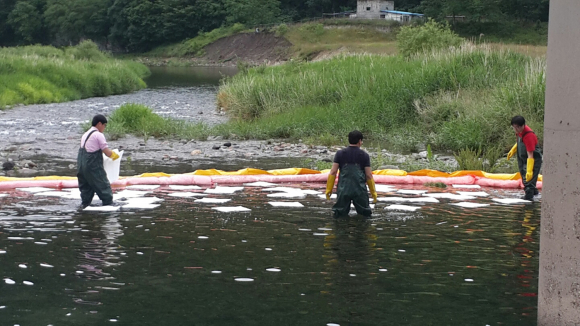 신고를 접수받은 영덕군에서는 지품면, 환경위생과 및 상하수도사업소의 긴밀한 협조아래 우선 상수 취수 중단을 요청한 후 오일펜스 및 오일흡착붐 등을 설치하여 더 이상의 하류로의 유출을 중단한 후 흡착포 등을 이용하여 기 유출된 유류를 완벽하게 제거한 다음 상수의 취수를 재개하게 된다는 내용이다.