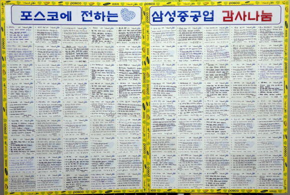- 생활 속 긍정마인드의 디딤돌인 감사엽서로 화답 포스코 포항제철소(소장 이정식)가 지난 3일 고객사 삼성중공업을 방문한 자리에서 삼성중공업 임직원 100명이 직접 쓴 5감사카드를 모아 만든 감사보드를 전달받아 눈길을 끌었다.