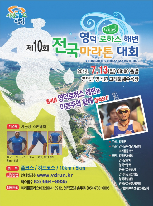 영덕군이 주최하고 영덕군육상경기연맹과 마라톤플러스가 공동주관하는『제10회 영덕로하스해변 전국마라톤대회』가 오는 7월 13일 일요일 오전8시 병곡면 고래불해수욕장에서 열린다.