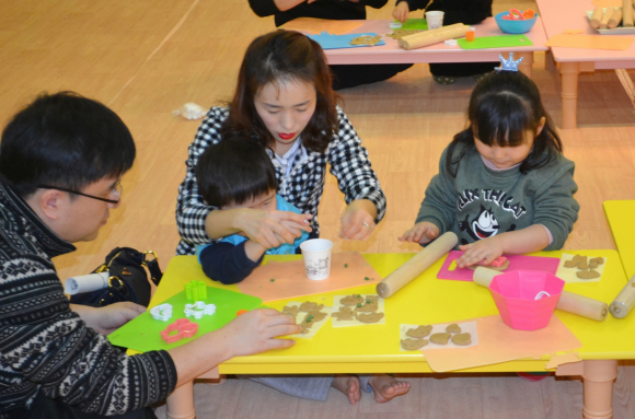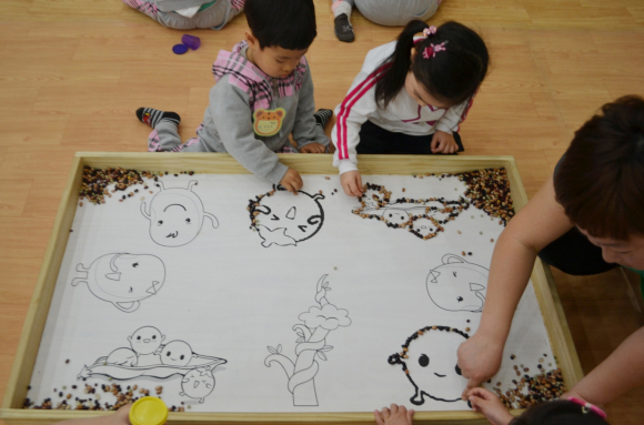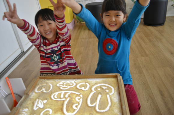 세 번째 테마 ‘콩이랑 가루랑’은 다양한 종류의 콩을 관찰하고, 콩과 콩가루를 이용한 모자이크 놀이, 그림 그리기를 통해 아이들의 집중력과 창의력을 길러준다.