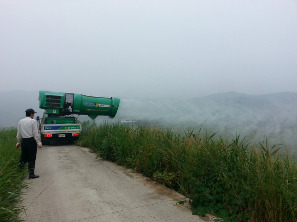 현재 발견된 멸강나방은 2~3령의 어린 상태로 4~5령 이후에는 방제효과가 떨어지기 때문에 7월 1일(화) 06:00~ 07:30까지 평동 남천주변 일대 약 6ha에 걸쳐 긴급방제 작업을 실시했다.