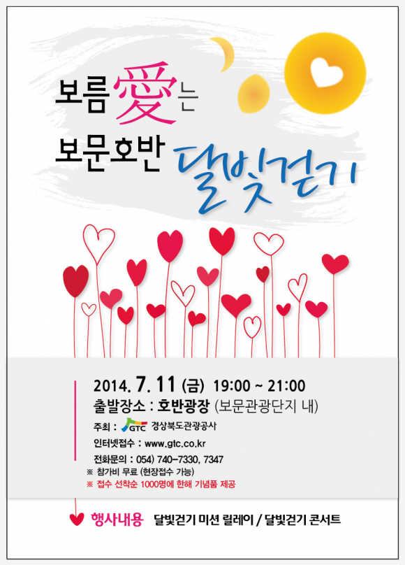 경상북도관광공사는 11일 보름날에 경주 보문관광단지 일원에서 "보름愛는 보문愛"보문호반 달빛걷기 행사를 개최한다.