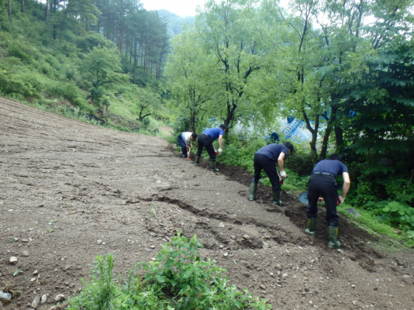 봉화군(석포면) 직원들이 지난 4일 장마대비 재해피해 우려지구에 대하여 긴급보강 조치를 했다.
