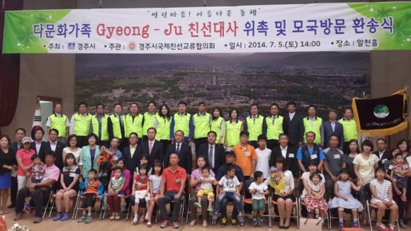 경주시에서는 5일 오후2시 시청 알천홀에서 2014년 결혼이민여성 친정보내기 사업에 최종 선정된 10세대에 대하여 경주시국제친선교류협의회 주관으로 “다문화가족 Gyeongju 친선대사 위촉 및 모국방문 환송식”을 개최했다.