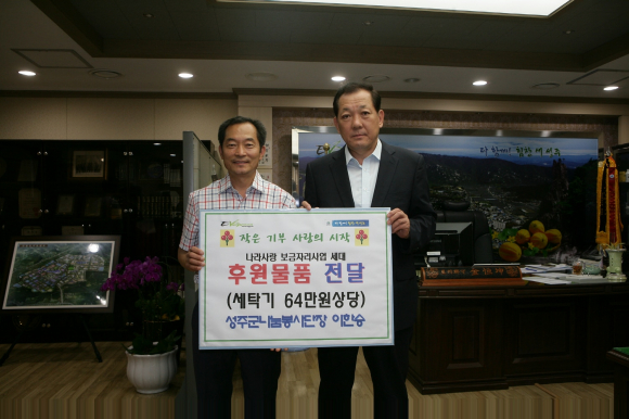 이한승 성주군 나눔봉사단장은 8일 오전 10시 군수실에서 2014년 나라사랑 보금자리사업 세대에 후원물품(세탁기, 64만원 상당)을 전달하는 행사를 가졌다.
