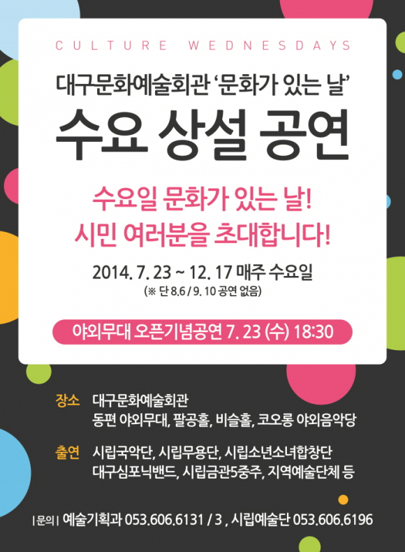 한편, 대구문화예술회관은 동편 야외무대에서 <문화가 있는 날 수요상설무대>를 수요일마다 선보이며 두류공원을 이용하는 시민들의 눈과 귀를 사로잡을 예정이다. 7월 23일(수) <야외무대 오픈 기념 공연>을 시작으로 7월부터 12월까지 수요일마다 공연을 펼친다. (단, 야외무대공연은 10월 말까지이며, 수요상설공연은 12월까지 진행 - 8월6일/ 9월10일 공연 없음.)