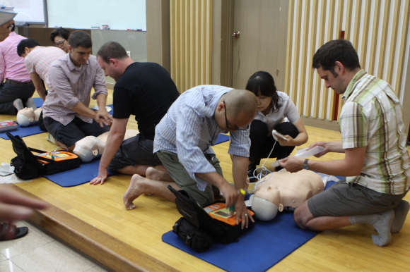 캠프의 전체를 관리•감독하는 외국인 교수들은 만약의 안전사고를 대비해 심폐소생술 및 인공호흡법 등의 응급조치를 익혔다.