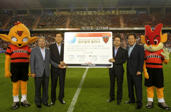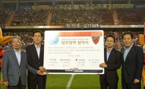 포항시가 20일 포항스틸야드에서 이강덕 포항시장과 최병곤 포항상공회의소회장, 장성환 포항스틸러스사장, 연규식 구룡포수협장이 참석한 가운데 포항 수산물 홍보를 위한 업무협약을 체결했다.