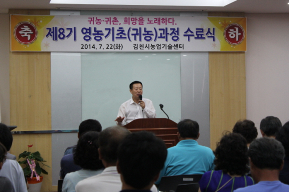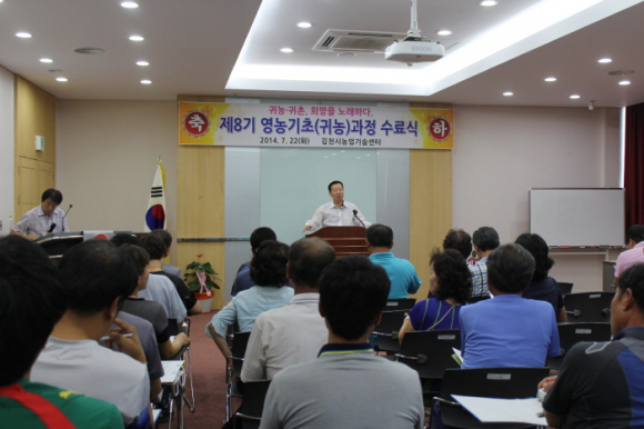 김천시(시장 박보생)에서는 귀농초기 성공적인 영농정착을 돕고 안정적인 농촌 생활을 유도하기 위해 지난 3월 14일부터 실시한 제8기 영농기초(귀농)과정 수료식을 22일 오후 2시 농업기술센터에서 수료생 49명이 참석한 가운데 개최했다.