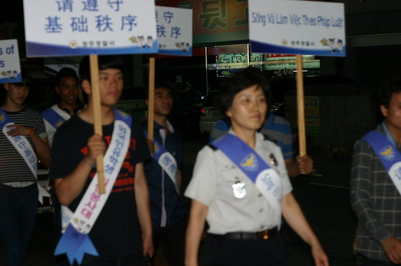 이번 캠페인에서는 취약지역 순찰과 아울러 상가일대에 중국어‧베트남어 등 3개국어로 홍보방송과 함께 가두 캠페인을 하며 외국인들에게 한국의 법질서 준수를 당부했다.