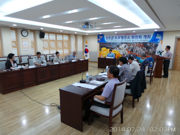 성주군은 24일(목) 14:00 도로명주소의 부여 및 변경, 폐지를 심의하기 위한 도로명주소위원회를 개최했다. 회의에 앞서 도로명주소위원회 위원장(부군수 전화식)은 “군민에게 친근감 있고 사용에 불편이 없는 도로명주소 부여를 위해 위원님들의 전문지식을 최대한 발휘해 줄 것”을 당부하였다.