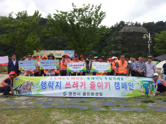 |  | | | ⓒ GBN 경북방송 | | 영천시(시장 김영석)에서는 본격적인 여름 휴가철을 맞아 7월 26일 임고강변공원에서 환경미화원, 클린환경팀 및 임고면 직원 등 70여명이 참가한 가운데 「행락지 쓰레기 줄이기 캠페인」을 실시했다.