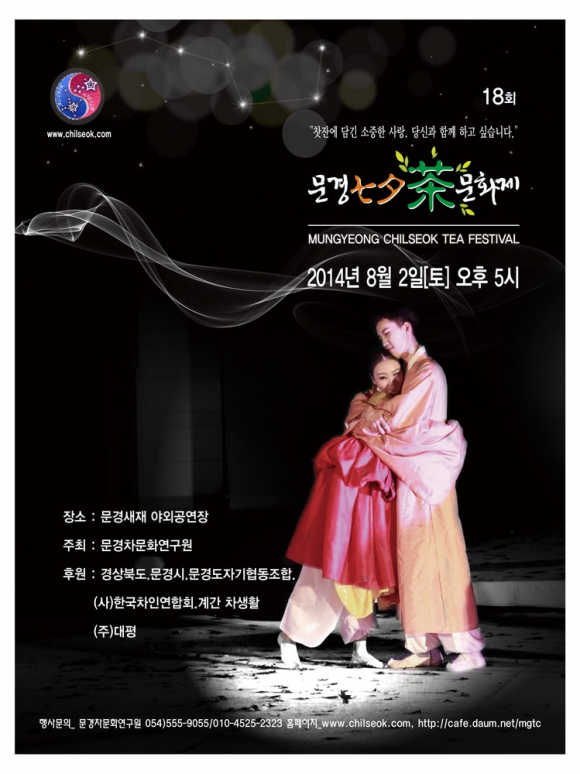 |  | | | ⓒ GBN 경북방송 | | 밤하늘의 별빛이 아름다운 한 여름밤 견우와 직녀가 만나는 칠월칠석을 맞이하여 “제18회 문경 七夕 茶 문화제”가 오는 8월 2일 아름다운 계곡물 소리와 흙길이 정겨운 문경새재 야외공연장에서 성대하게 개최된다. 경상북도와 문경시, 사)한국차인연합회가 후원하고 문경차문화연구원(원장 고선희)의 주관으로 개최되는 이번 칠석 차문화제는 전국 각지에서 문경을 찾는 많은 차인들과 관광객 그리고 차를 사랑하는 시민들과 함께한 가운데 오후 2시부터 아름다운 차도구 소장품대회, 복떡 나누기, 견우‧직녀 다식체험 등 다채롭고 풍성하게 펼쳐질 계획이다.