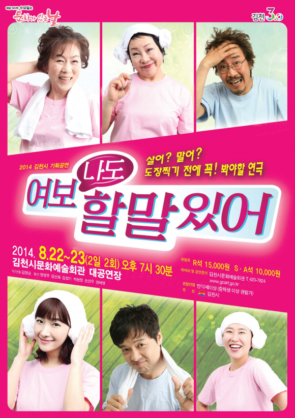 김천시(시장 박보생)는 민선 6기를 맞이하여 사랑하는 가족과 연인 그리고 시민 모두를 위해 오는 22~23일 중 오후 7시 30분 두 차례에 걸쳐 문화예술회관(대공연장)에서 ‘여보 나도 할 말 있어’ 연극을 선보인다.