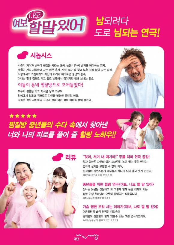 찜질방을 배경으로 일상을 나누는 자매 같은 사람들, 표정만으로도 서로 위로할 수 있는 중년층들의 생생한 에피소드들이 담긴 연극은 마치 우리 집, 우리 이웃의 이야기를 옮겨 놓은 것 같다.