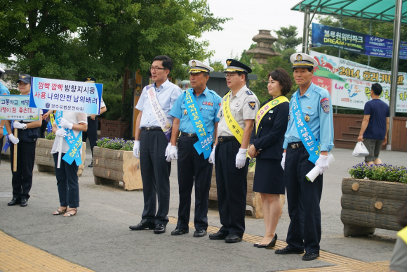 경주경찰서(서장 곽생근)는 29일(화) 08:00 경주역삼거리에서 경주시청, 모범운전자경주지회, 녹색어머니회와 합동으로 휴가철 교통무질서근절 홍보캠페인을 실시했다.