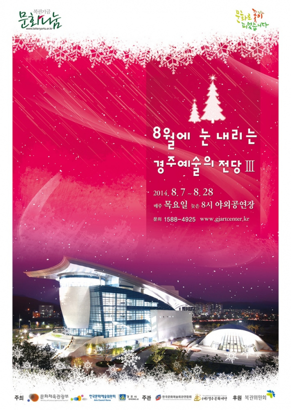 “8월에 눈 내리는 경주예술의전당 시즌 3”가 프로그램을 더욱 다양화하여 8월 7일부터 28일까지 매주 목요일 오후 8시에 경주예술의전당 야외공연장에서 펼쳐진다. 2012년부터 시작한 “8월에 눈 내리는 경주예술의전당”은 폭염시즌 경주시민과 관광객들에게 시원한 휴식 공간을 색다르게 제공해드리고자 경주예술의전당이 기획제작한 프로그램으로 8월 한 달 간 매주 다양한 장르의 특색 있는 작품들을 야외공연장에서 무료로 제공하는 공연이다.