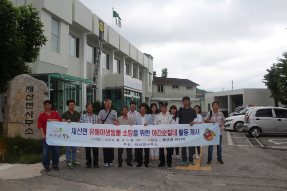 봉화군 재산면(면장 신승택)에서는 최근 유해야생동물의 빈번한 출몰로 수확기 농작물의 피해사례가 발생되는바 재산면사무소 직원 11명, 자율방범대원 9명 등으로 구성된 야간순찰조를 조직, 4일(월), 15:00시, 면사무소 전정에서 발대식을 가졌다.