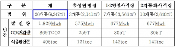 특히, 3사관학교는 자원·에너지가 선순환하는 자원순환사회 실현과 동시에 충성연병장과 야외훈련장 등 군부대 시설에 필요한 차양대 설치(국방부 예산 28억원 절감)는 물론, 추후 임대기간(20년) 종료 후 해당 태양광 발전설비를 기부 채납 받아 연간 발전량을 전력운영에 활용함으로써 국방예산 절감(연간 3.84억 원) 효과에도 크게 기여할 것으로 기대하고 있다.