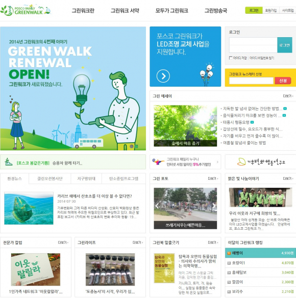 |  | | | ↑↑ 그린워크 홈페이지 | | ⓒ GBN 경북방송 | | 포스코(회장 권오준)가 패밀리사 임직원들과 가족 중심으로 참여를 시작한 환경운동 ‘그린워크’ 캠페인을 지속 실천하며 에너지 절약 습관을 전파하고 있다.