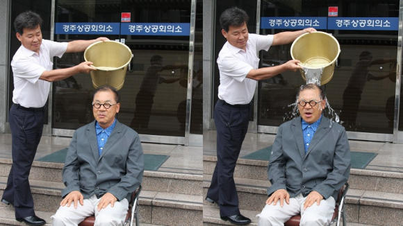 경주상공회의소 김은호 회장은 지난 27일 경주상공회의소 현관 앞에서 루게릭병 환자를 위한 캠페인인 「아이스 버킷 챌린지」에 참여했다.