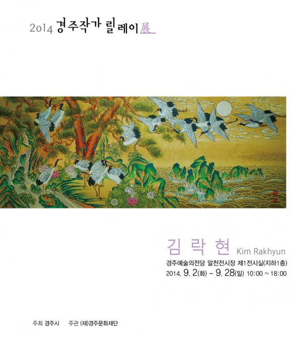‘경주작가 릴레이展’은 지역 예술가들의 창작의욕을 고취시키고, 전시활동공간을 제공하고자 작년에 처음 기획된 전시로, 공모를 통해 최종 선정된 13명의 작가가 12월 21일까지 경주예술의전당 알천전시장(B1)에서 릴레이 전시를 진행한다. 전시는 오전 10시부터 오후 6시까지 운영하며, 매주 월요일은 휴관이다. 김락현 작가의 전시는 9월 28일(일)까지 진행되며, 다음 주자는 회화 작가 최한규다.