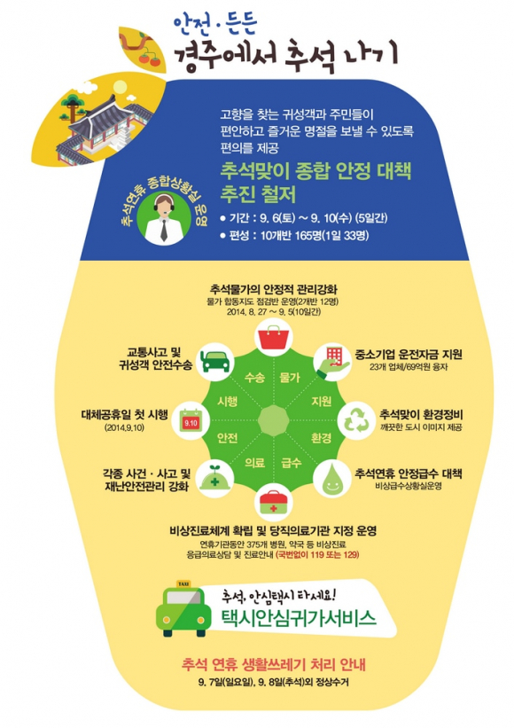 경주시는 예년보다 빠른 추석을 맞아 고향을 찾는 귀성객과 주민들, 그리고 연휴기간 동안 경주를 찾는 관광객들이 편안하고 즐거운 명절을 보낼 수 있도록 종합 안전 대책을 수립하고, 편의를 제공한다. 시는 6일부터 10일까지 5일간 추석 연휴에 대비한 종합대책상황실을 운영한다.