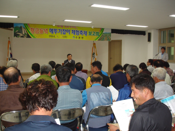 수륜면에서는 3일(수) 오후 2시 면사무소 2층 회의실에서 배재만 군의원을 비롯한 수륜면 관내 기관 및 사회단체장과 이장 등 60여 명이 참석한 가운데 황금들녘 메뚜기잡이 체험축제 최종 보고회를 가졌다.