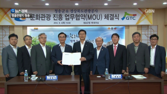 |  | | | ⓒ GBN 경북방송 | | 한동수 청송군수는 협약식에서 “청송군은 농정중심의 행정을 안정시킨 상태에서 미래에는 명품관광지 청송으로 거듭나려는 청사진을 진행 중”이라면서 “이런 시점에 청송을 찾아 관광업무협약을 체결한 경북관광공사 김태식 사장직무대행과 이희도 관광마케팅본부장 및 일행에게 감사함을 전한다”고 밝혔다.