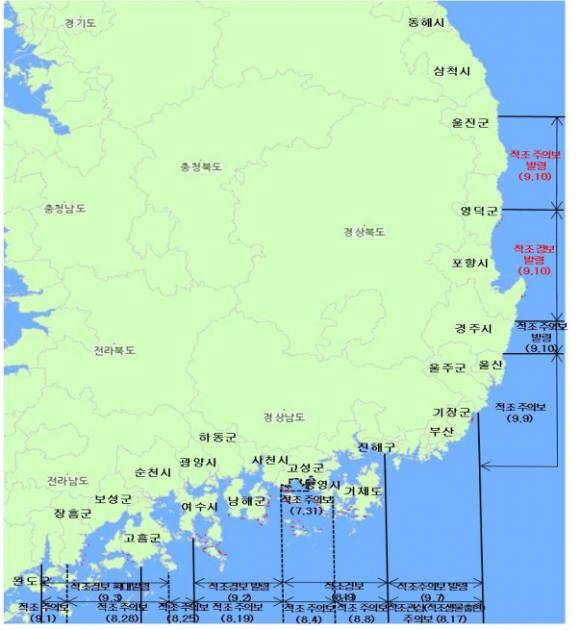 경주 감포항 등 3개 지역에는 적조피해 발생은 아직 없으나 지난 10일 적조는 영덕군 축산면에서 포항 구룡포 하정리 해역까지 발생, 해양수산부 국립수산과학원은 10일 오후 7시를 기해 포항 연안 일원에 적조 경보를 발령했다.