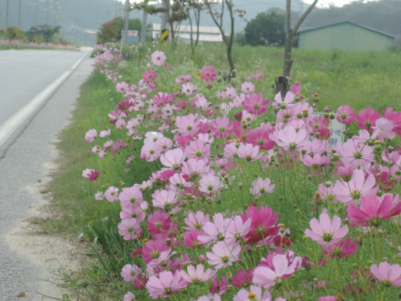 활짝 핀 코스모스, 나그네 발길 붙잡아 구 36번 국도, 918 지방도, 목재문화 체험관 가는 길 장관