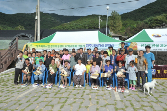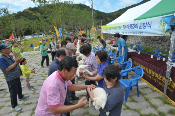 경주개 동경이 사업단(단장 최석규)은 지난 13일 건천 용명리 탑골 동경이 마을에서 마을 주민들과 사)한국 경주개 동경이 보존협회 회원 등 100여명이 참석한 가운데 천연기념물 제540호 경주개 동경이를 전달하는 분양식을 가졌다.