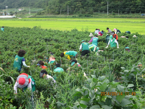 영양고추 따러 왔서예!! 행 사 명 : 도시민 초청 도∙농 체험 교류 행사 목 적 : 자매결연단체 초청(부산시 대연동 새마을지회)고추따기 체험 행사 실시 일 자 : 2014. 09. 14.(일) 단 체 : 농촌지도자영양군연합회