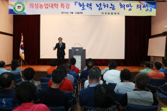 의성농업대학 학생들은 16일 오후 3시 의성군 농업기술센터에서 민선 6기 “활력 넘치는 희망의성”을 주제로 김주수(의성군수)농업대학 학장님의 특강을 가졌다. 이번 특강에 마늘반 40명, 복숭아반 40명, 일반농업반 40명으로 120명이 참석했다.