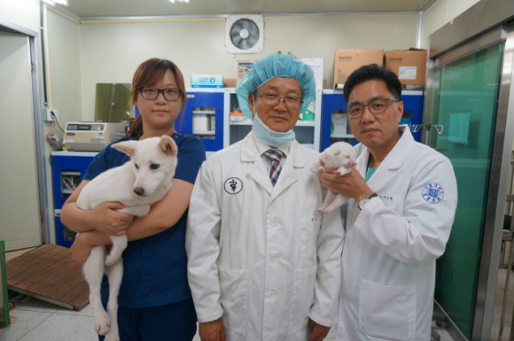 사진설명 서울대 수의과대학 이병천교수 개 복제 연구실 (최유빈대학원생, 동국대 동경이 연구소 최석규교수, 서울대 이병천교수)