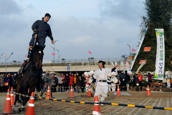 이와더불어 올해 새롭게 시연되는 ‘마상재’는, 한일양국의 평화를 위해 일본에서 요청, 1607년부터 204년간 12차례 일본으로 갔던 문화와 평화사절단이라 할 조선통신사 사행원들이 서울을 출발하여 일본으로 가는 일행들이 영천에서 집결하였는데(註. 사통팔달의 교통요충지, 임진왜란 최초로 영천읍성 복성, 신녕 장수도찰방에 의한 마필 제공, 고려말 일본에 파견, 포로들을 귀환시킨 한국 성리학의 시조 포은 정몽주선생이 창건한 조양각 등 영남좌로의 요충지) 경상감사가 임금을 대신하여 영천 조양각에서 전별연을 베푸는 한편, 금호강변에서 말을 타고 다양한 기술을 부렸다는 김인겸(영조40년 1763년, 제11차 통신사 사행원)의 일동장유가를 비롯한 당시의 몇몇 기록을 바탕으로 시연하는 행사다.