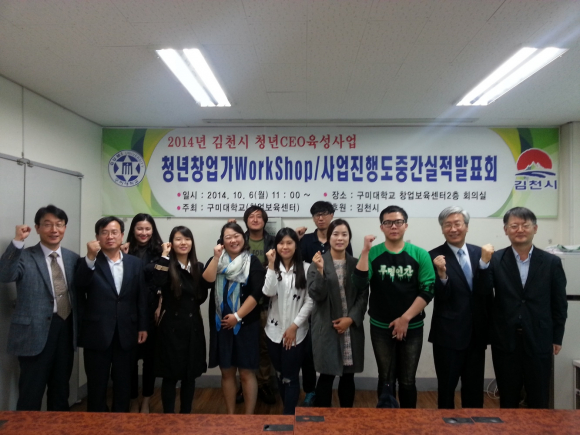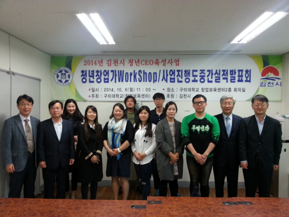 구미대학교(창업보육센터)가 주관하고 김천시가 후원하는 「2014 김천시 청년창업가 워크숍 및 중간실적 발표회」가 지난 10월 6일 구미대학교 창업보육센터 2층 회의실에서 개최되었다. 이번 발표회는 창업활동 분위기 조성 및 청년창업가 간의 경쟁심 유발을 통한 창업성공률 제고와 청년창업가 자신들의 사업성과 발표를 통하여 향후 CEO의 자질을 함양하고자 실시된 것이다.