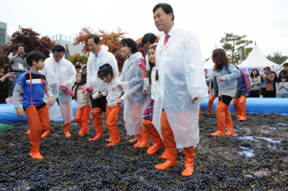 이어서『2014 영천와인 어불러 담기』행사를 위해 참가자들이 장화를 신고 넓은 통속에서 신나는 음악과 함께 포도를 밟아 와인을 만든다. 이것은 2015년 제3회 영천와인 페스타에서 맛볼 수 있도록 준비하는 행사다.
