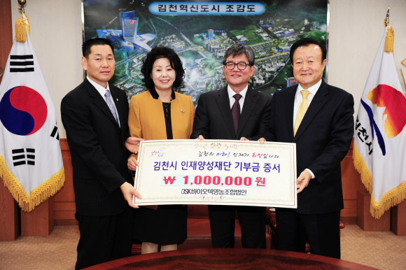 김천시 미래를 위한 우수인재육성과 김천교육발전을 위해 조성 중인 김천시인재양성재단에 장학금 기탁이 줄을 잇고 있다. DSK바이오텍영농조합법인(회장 김응교)은 17일 오전 김천시청을 방문하여 김천시인재양성재단에 장학금을 기탁했다.