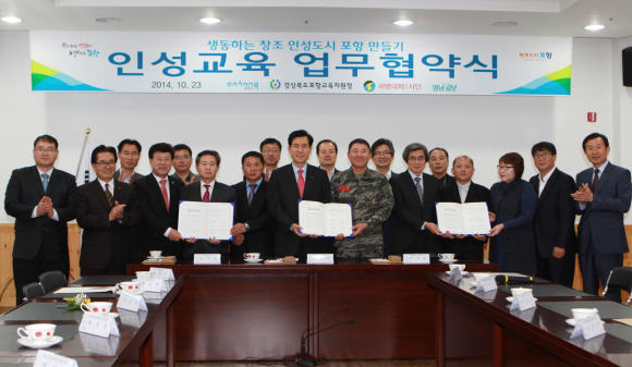 시는 23일 새마을운동 발상지기념관에서 이강덕 포항시장과 황우현 해병대제1사단장, 손인락 영남일보사장, 최영희 학교운영위원장협의회장과 관계자 등이 참석한 가운데 생동하는 창조 인성도시 포항을 만들기 위한 ‘인성교육 업무협약식’을 체결했다.