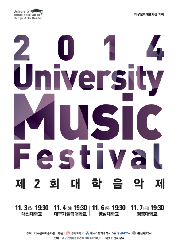 대구문화예술회관은 기획공연으로 <제2회 대학음악제>를 11월 3일~7일까지 (5일제외) 4일간 개최한다. 본 공연은 오케스트라, 합창, 앙상블 등 다양한 규 모로 구분 없이 자유롭게 프로그램을구성하도록 하여 대학별 특성과 학생들의 열정을 그대로 느낄 수 있다.