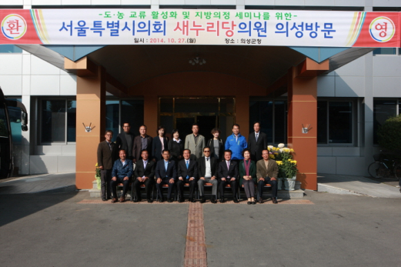 의성군에 따르면 서울시의회 새누리당 김진수 대표의원을 단장으로 강감창 시의회부의장, 이명희,황준환 부대표 등 방문단 20명이 의성군을 방문했다고 전했다. 방문은 10월 27일 오후 1시부터 3시까지 의성군청회의실에서 김주수 의성군수, 신원호 의성군의회의장, 정도진 부의장, 최태림 경상북도의회의원 등이 함께했다.