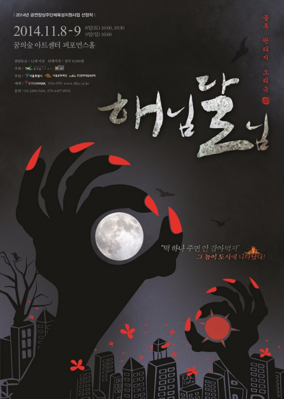 |  | | | ⓒ GBN 경북방송 | | 세종문화회관(사장 박인배)이 운영하고 있는 꿈의숲 아트센터에서는 오는 11월 8일(토)부터 9일(일)까지 총 3회에 걸쳐 블루 판타지 소리극 <해님달님>을 공연 한다. <해님달님>은 2014년 공연장상주단체육성지원사업에 선정된 작품으로, <닭들의 꿈, 날다>(제 1회 창작국악극대상 최우수 작품상 및 음악상 수상)를 제작한 바닥소리가 꿈의숲 아트센터에서 올리는 세 번째 공연이다. 꿈의숲 아트센터와 판소리공장 바닥소리가 주최하고, 서울특별시, 서울문화재단, 한국문화예술위원회가 후원하고 있다. 관람료는 전석 1만원이며, 11월 8일(토)부터 9일(일)까지 꿈의숲 아트센터 퍼포먼스홀에서 공연한다. 공연시간은 토요일 오후 4시 및 7시 30분, 일요일 오후 4시이다. 문의 02-2289-5401