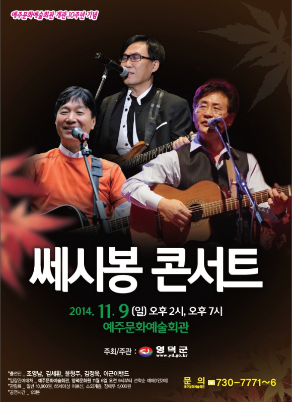 |  | | | ↑↑ 세시봉 | | ⓒ GBN 경북방송 | | 11월의 공연 계획 중 9일에는 예주문화예술회관 실내공연장에서 인기가수 조영남, 김세환, 윤형주와 전속밴드가 참여하는 ‘세시봉 콘서트’가 열린다.