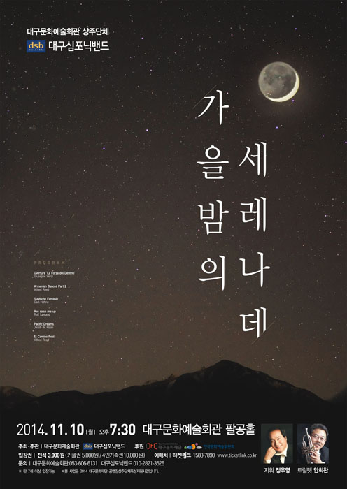 대구문화예술회관 상주단체 대구심포닉밴드는 오는 10일(월) 저녁 7시 30분에 대구문화예술회관 팔공홀에서 올해 마지막 가을밤을 위한 <가을밤의 세레나데>로 2014년도 세 번째 정기 공연을 선보인다.