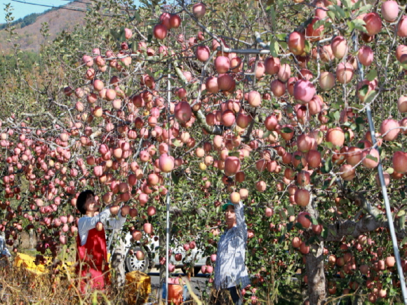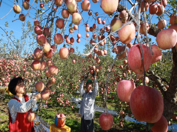 본격적인 수확철을 맞아 5일 오후 포항시 북구 죽장면 한 사과 농가에서 농민들이 분주한 손길로 사과를 수확하고 있다.