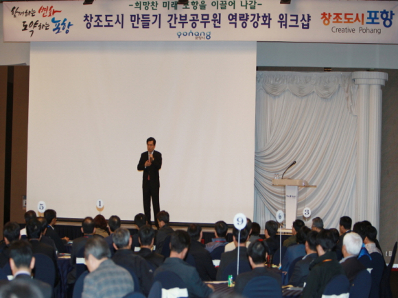 포항시는 급변하는 경제 환경을 이해하고 대응할 수 있는 공무원으로써 역량강화와 창의적 마인드 제고를 통해 시민과 함께하는 창조도시 건설로 풍요로운 포항의 미래를 만들어 가기 위해 지난 10월말에 6급 공무원을 대상으로 ‘창조도시 건설을 위한 워크숍’을 시작한데 이어 전 공무원을 대상으로 확대해 나갈 예정이다. |