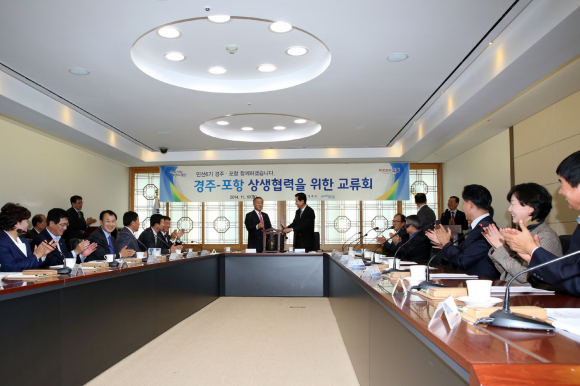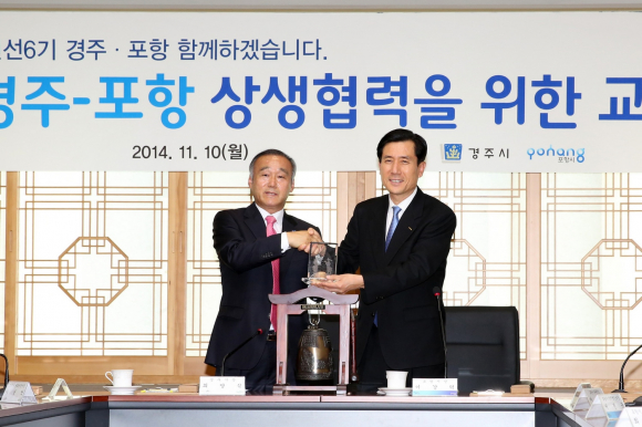 최양식 경주시장과 이강덕 포항시장은 포항시청에서 양 도시의 친수공간인 형산강을 공동개발 하여 상생발전의 성장 동력으로 활용하는데 공감대를 같이 하고 11일 첫 만남을 가졌다.