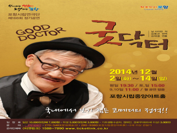 |  | | | ⓒ GBN 경북방송 | | 포항시립연극단이 다음달 2일부터 14일까지 12일간(총 13회 공연) 시립중앙아트홀에서 제168회 정기공연 ‘굿닥터’를 선보인다.