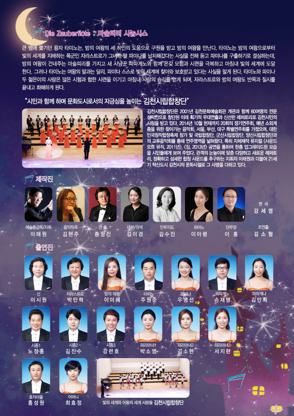 또한 김천시립합창단의 ‘마술피리’는 기존 오페라에서 볼 수 없었던 다양한 시도와 정통을 추구하는 음악성으로 모차르트가 진정으로 원했던 소통하는 음악의 진면목을 관객에게 선물할 것이다.